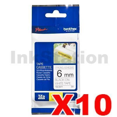 10 x Brother TZe-S211 Genuine 6mm Black Text on White Strong Adhesive Laminated Tape – 8 metres