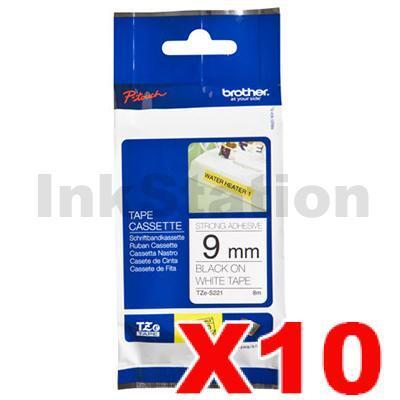 10 x Brother TZe-S221 Genuine 9mm Black Text on White Strong Adhesive Laminated Tape – 8 metres