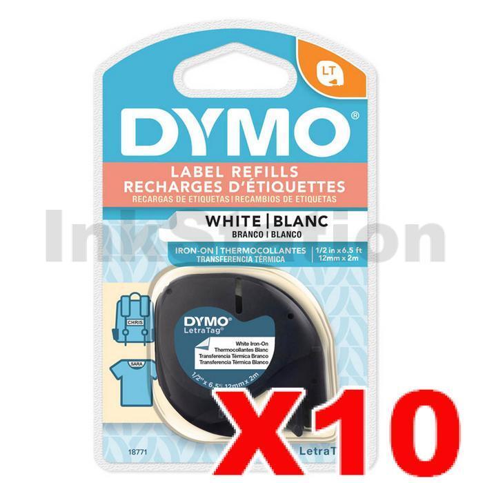 10 x Dymo 18771 Genuine 12mm x 2m Black on White LetraTag Label Iron-On Fabric Tape