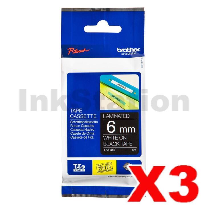 3 x Brother TZe-315 Genuine 6mm White Text on Black Laminated Tape – 8 meters