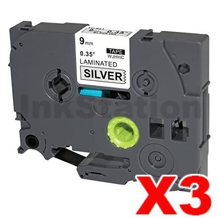 3 x Brother TZe-921 Compatible 9mm Black Text on Silver Laminated Tape – 8 meters