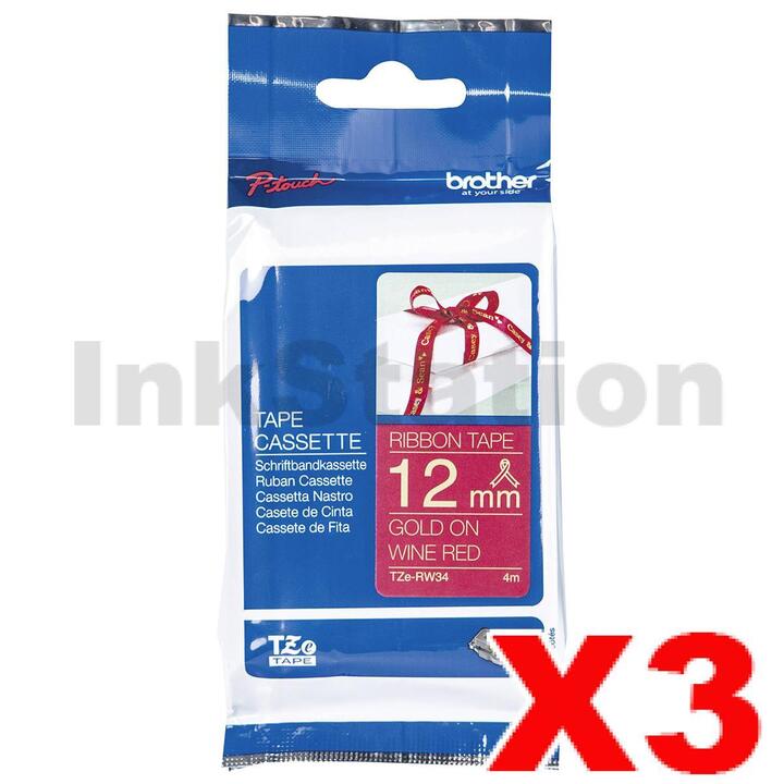 3 x Brother TZe-RW34 Genuine 12mm Gold Text on Wine Red Ribbon Tape – 4 metres