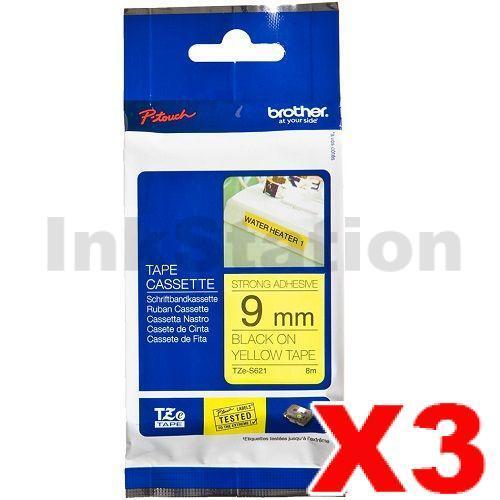 3 x Brother TZe-S621 Genuine 9mm Black Text on Yellow Strong Adhesive Laminated Tape – 8 metres
