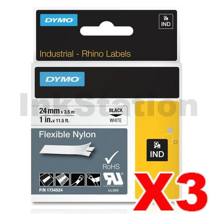 3 x Dymo 1734524 Genuine 24mm Black Text on White Flexible Nylon Industrial Rhino Label Cassette – 3.5 meters