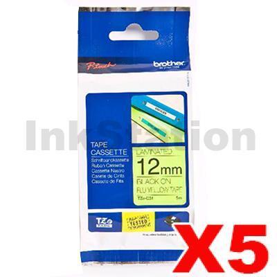 5 x Brother TZe-C31 Genuine 12mm Black Text on Yellow Fluorescent Laminated Tape – 5 meters