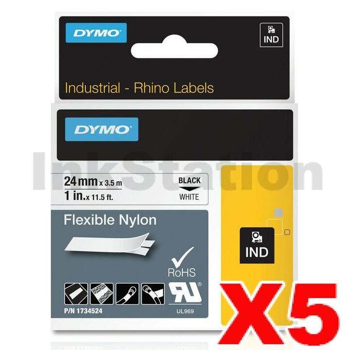 5 x Dymo 1734524 Genuine 24mm Black Text on White Flexible Nylon Industrial Rhino Label Cassette – 3.5 meters