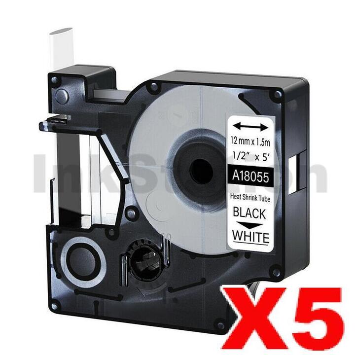 5 x Dymo SD18055 Compatible 12mm Black Text on White Heat-Shrink Tube Industrial Rhino Label Cassette – 1.5 meters