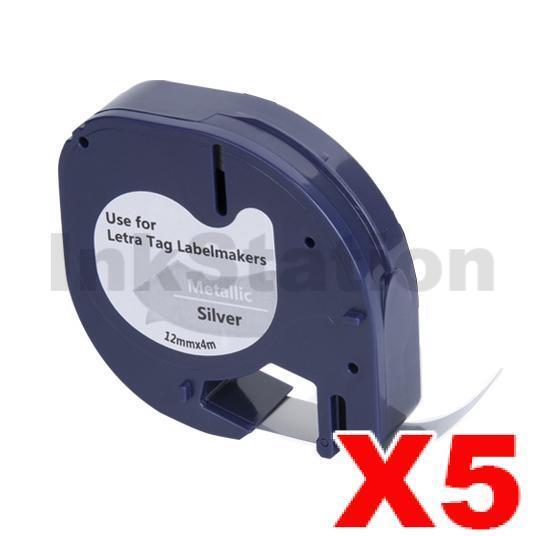 5 x Dymo SD91208 / 91338 Compatible 12mm x 4m Black On Silver LetraTag Metallic Tape