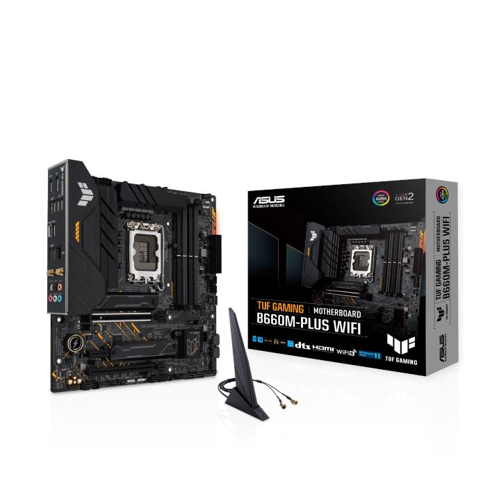 ASUS TUF GAMING B660M-PLUS WIFI takes all the essential elements of the latest Intel® processors and combines them with game-ready features and proven durability. Engineered with military-grade components, an upgraded power solution and a comprehensive cooling system, this motherboard offers rock-solid and stable performance for marathon gaming. Aesthetically, TUF GAMING B660M-PLUS WIFI sports the new TUF Gaming logo and incorporates simple geometric design elements to reflect the dependability and stability that defines the TUF Gaming series.