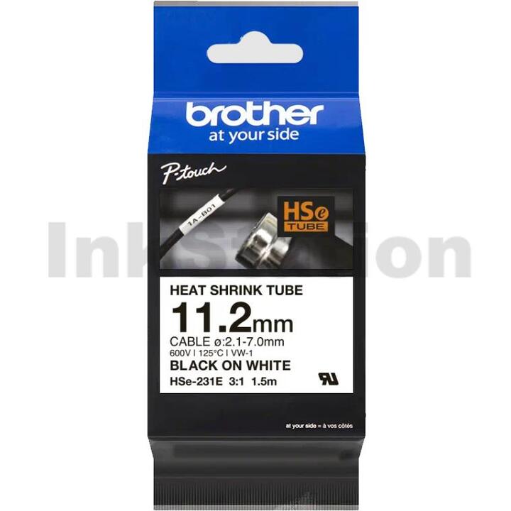 Brother HSe-231E Genuine 11.2mm Black Text on White Heat Shrink Tube Tape – 1.5 meters