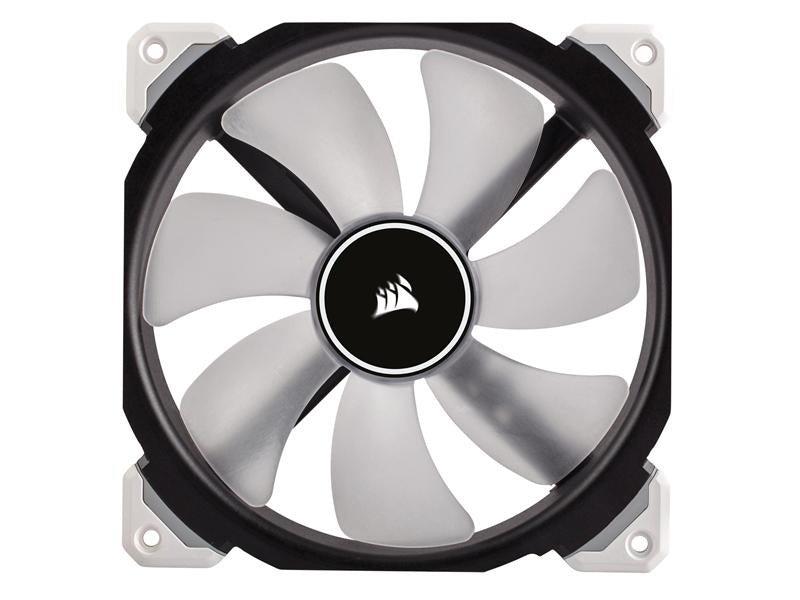 Corsair ML140 Pro, Air. Suitable for: Computer case, Type: Fan, Fan diameter: 14 cm. Illumination colour: White, Product colour: Black,White. Rated current: 0.276 A. Width: 140 mm, Depth: 25 mm, Height: 140 mmCorsair is expanding its range of fans with the introduction of the ML series, an acronym that reveals the technological nature of the new series of magnetic levitation fans.The Corsair ML fans provide quiet operation and excellent performance, thanks to magnetic levitation of the rotor and the owner of the design of the fan blades.The innovative design is able to considerably increase both the static pressure and a flow of air, thanks to the very low friction of the magnetic levitation system.Moreover, thanks to the 4-pin PWM connector is possible to adjust timely the fan rotation speed so as to manage the performance / noise ratio appropriately.The PRO version includes in the package a set of silicone nose pads, interchangeable with optional sets of various colors (red, white and blue) that have the dual function to cancel the vibrations produced by the fan itself and beautify the fan, matching the color of nose pads to that of your system!Finally, the LED version is equipped with 4 high-brightness LED inserted in the rotor of the fan, guaranteeing maximum brightness and uniform lighting along the translucent material blades.