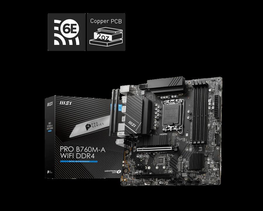 Supports Intel Core 12th & 13th Gen ProcessorsThe PRO B760M-A WIFI DDR4 motherboard supports 12th & 13th Gen Intel Core, Pentium Gold, and Celeron processors.- Form Factor: Micro-ATX- Socket Type: LGA 1700- Chipset: Intel B76012+1 Duet Rail Power System with P-PAK With its 8 pin + 4 pin power connectors and exclusive Core Boost technology, the PRO B760M-A WIFI DDR4 is able to sustain heavy CPU power loads to support system-demanding work settings:- Digital PWM IC- 12-Phase Duet Rail CPU Power (P-PAK)- 1-Phase GT Power- 1-Phase AUX Power